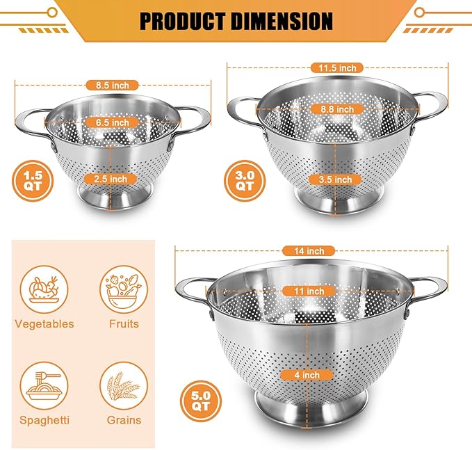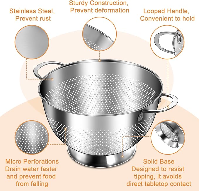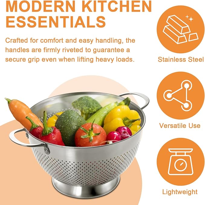 This generous five-quart stainless steel colander features a beautiful, non-reactive finish and easy-to-grasp handles. Its footed design keeps it stable while draining produce and straining broth.